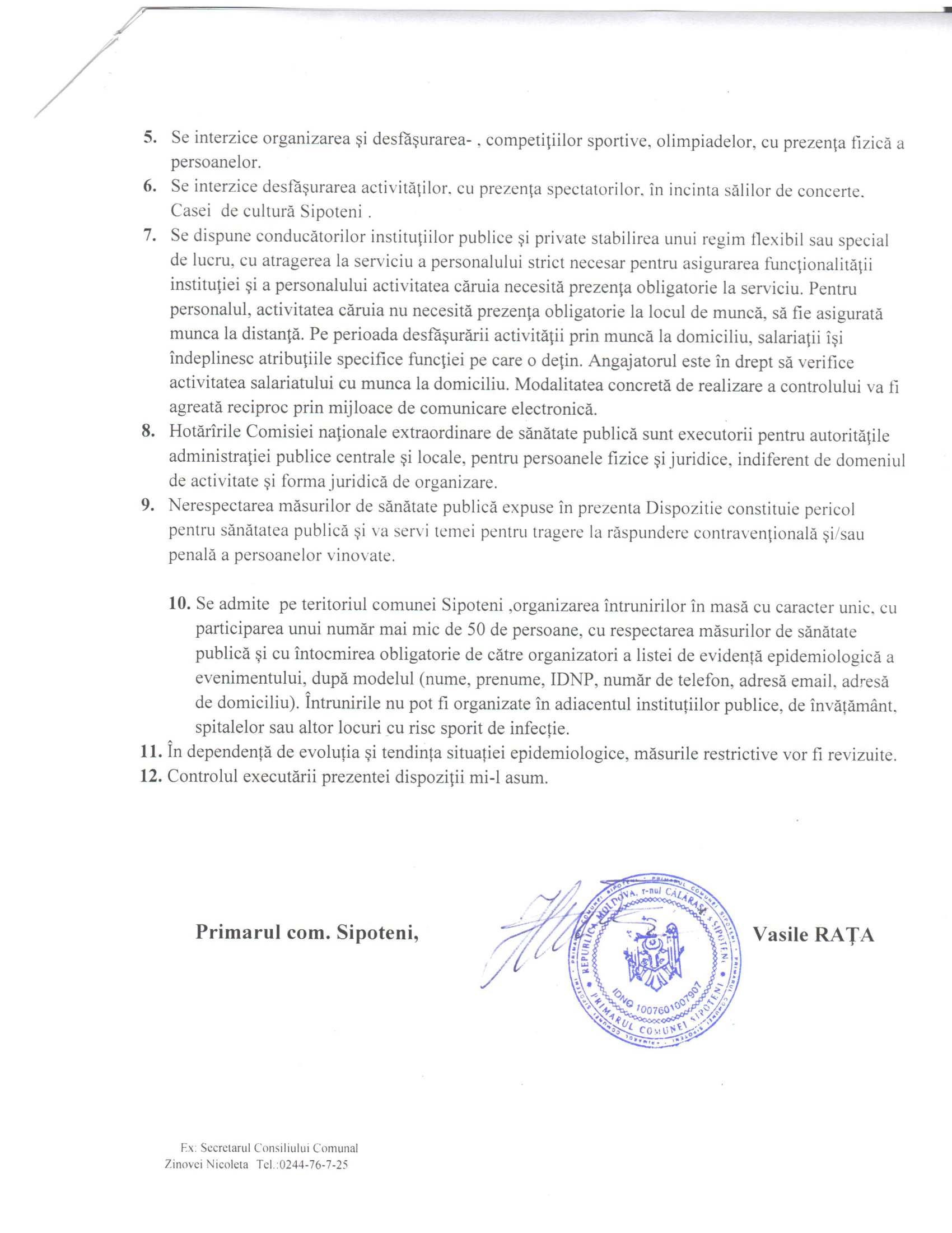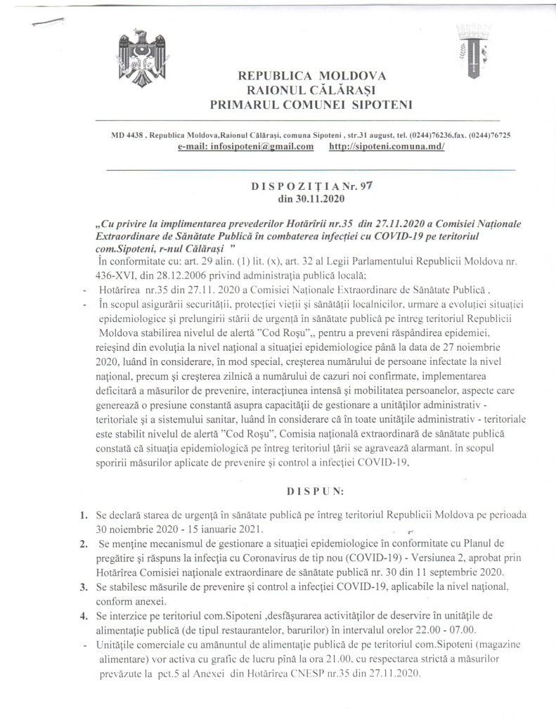 Dispoziție cu privire la implimentarea Hotărârii nr. 35, referitor la combaterea infecției cu COVID-19