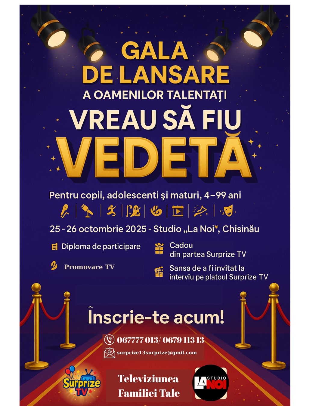 Vă informăm că Surprize TV organizează pe 25-26 octombrie un eveniment ,,Gala de lansare Vreau să fiu vedetă” !